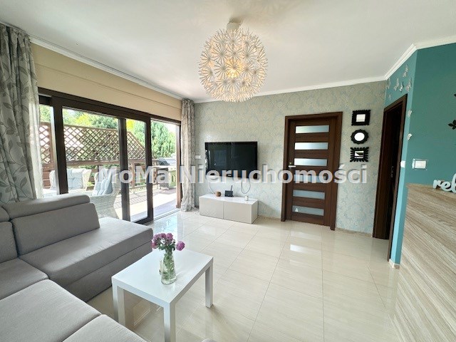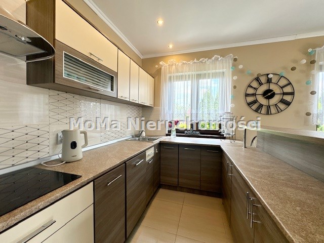 W salonie znajduje się duży narożnik, szafka RTV oraz telewizor. Kuchnia wyposażona została w liczne szafki, sprzęt AGD (duża lodówko-zamrażarka, piekarnik, zmywarka oraz okap)