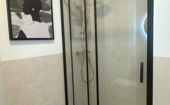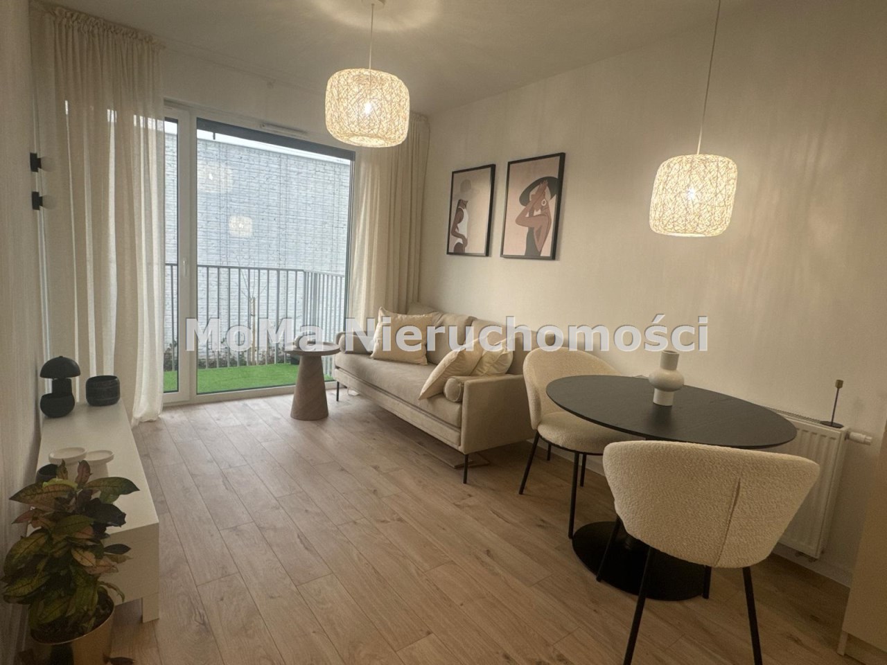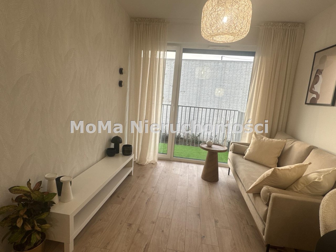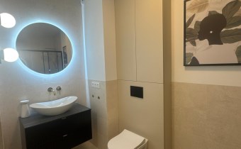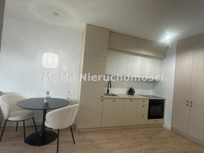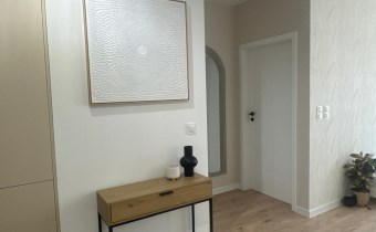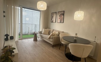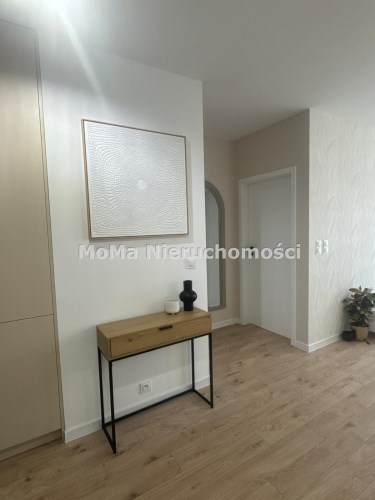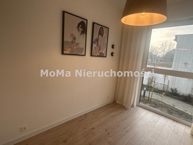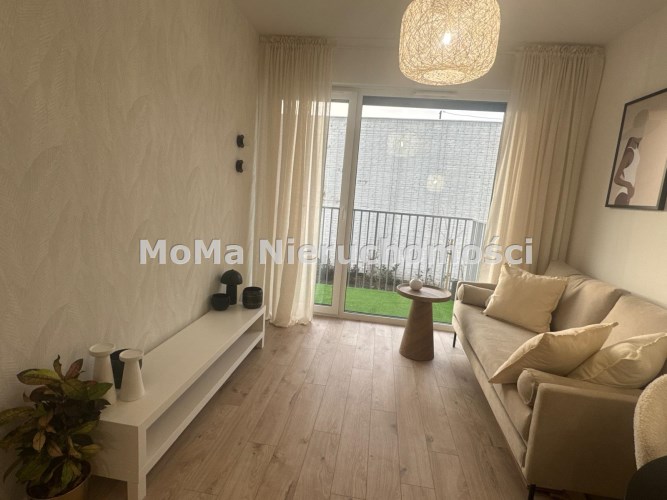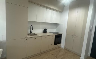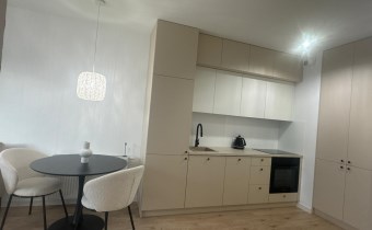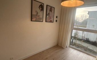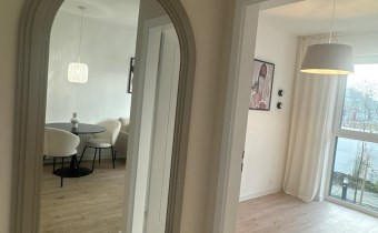 Gustownie urządzona kuchnia z duża ilością szafek, wyposażona jest w sprzęt AGD (piekarnik, płyta indukcyjna, okap, lodówka-zamrażarka, zmywarka) doskonale komponuje się z otwartym salonem, w którym znajduje się wygodna rozkładana kanapa, stolik i komoda z miejscem na telewizor co tworzy przytulne nowoczesne wnętrze. Sypialnia została zabudowa dużą szafą . Nowoczesna łazienka wyposażona jest w prysznic z deszczownicą oraz meble łazienkowe, duże gresowe płytki, baterie podtynkowe, podwieszane wc. W korytarzu zamontowano dużą szafę, konsolę oraz duże lustro, które stanowią spójną zabudowę z resztą pomieszczeń. Podłogi w mieszkaniu są w jednolitym drewnianym kolorze. Mieszkanie jest jasne, przestronne, ma duże panoramiczne okna gwarantują mnóstwo światła.
