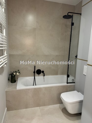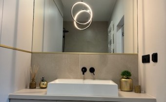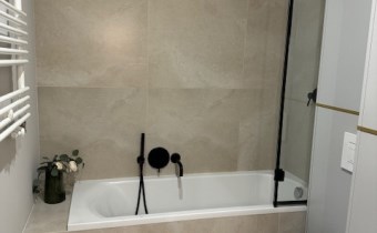 Łazienka: wanna z parawanem z deszczownicą, podwieszane WC, umywalka nablatowa oraz szafka, pralko-suszarka.