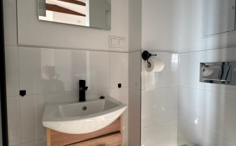 Łazienka: kabina prysznicowa z baterią z deszczownicą, podwieszane WC, umywalka nablatowa oraz szuflady.