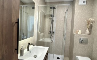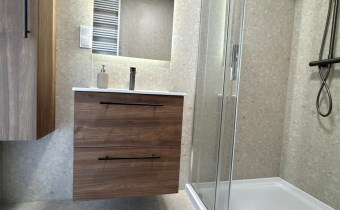 Łazienka: kabina prysznicowa z baterią, podwieszane WC, umywalka z szafką, pralka.