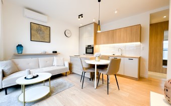Salon: sofa 3-osobowa, stolik, stół z 3 krzesłami, biała komoda z miejscem i podłączeniem pod TV, klimatyzacja.