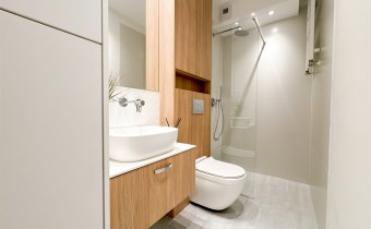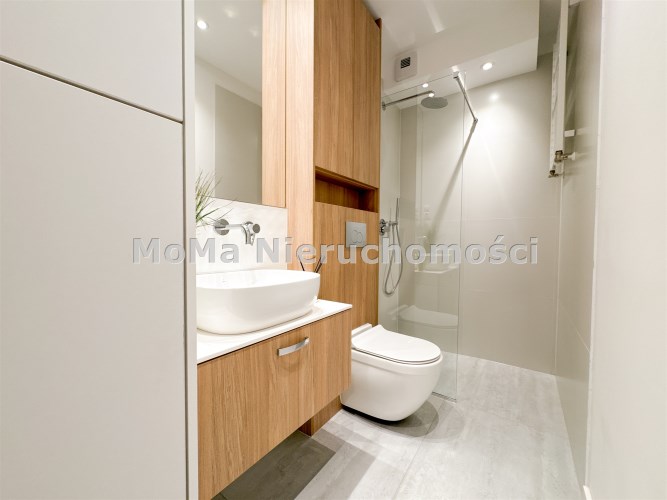 Łazienka: prysznic walk-in z baterią z deszczownicą, podwieszane WC, umywalka nablatowa z szufladami, zabudowa meblowa, pralka.
