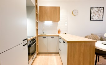 Kuchnia: sprzęty kuchenne (płyta indukcyjna, okap, piekarnik, zmywarka, lodówko-zamrażarka).