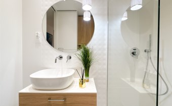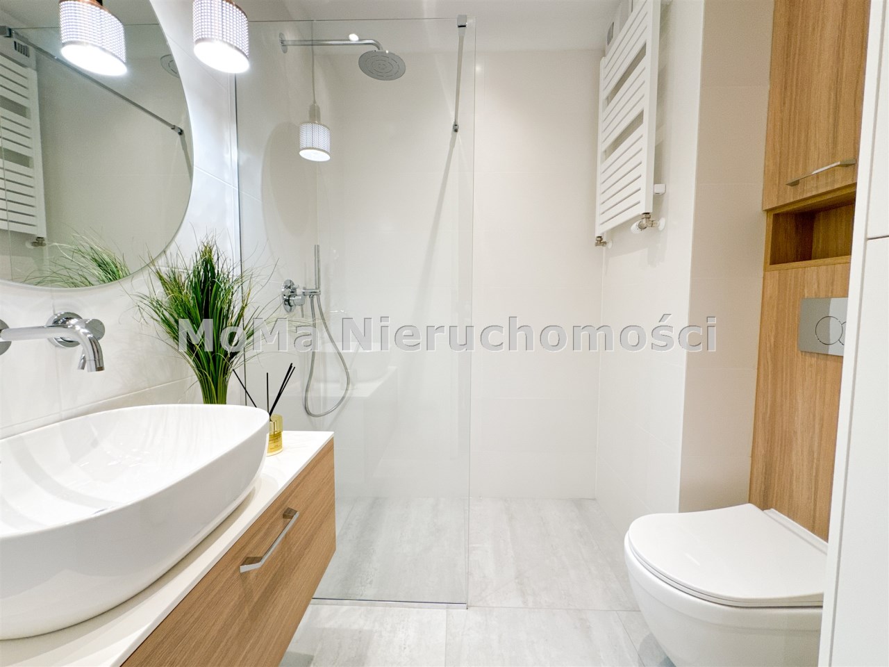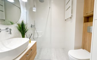 Łazienka: prysznic walk-in z baterią z deszczownicą, podwieszane WC, umywalka nablatowa z szufladami, zabudowa meblowa, pralka.