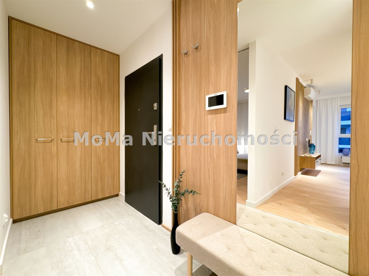 Przedpokój z lustrem, pufem i szafą do przechowywania.